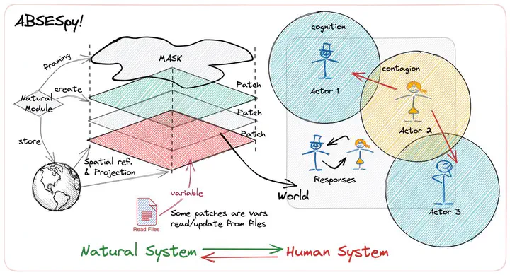 also supports modeling human behavior through well-recognized workflows of perception, decision-making definitions, and responses. Moreover, it advances real-world modeling with multiple time operating modes, accommodating the diverse temporal scales of SES phenomena and integrating time-sensitive event simulations. These innovations position ABSESpy